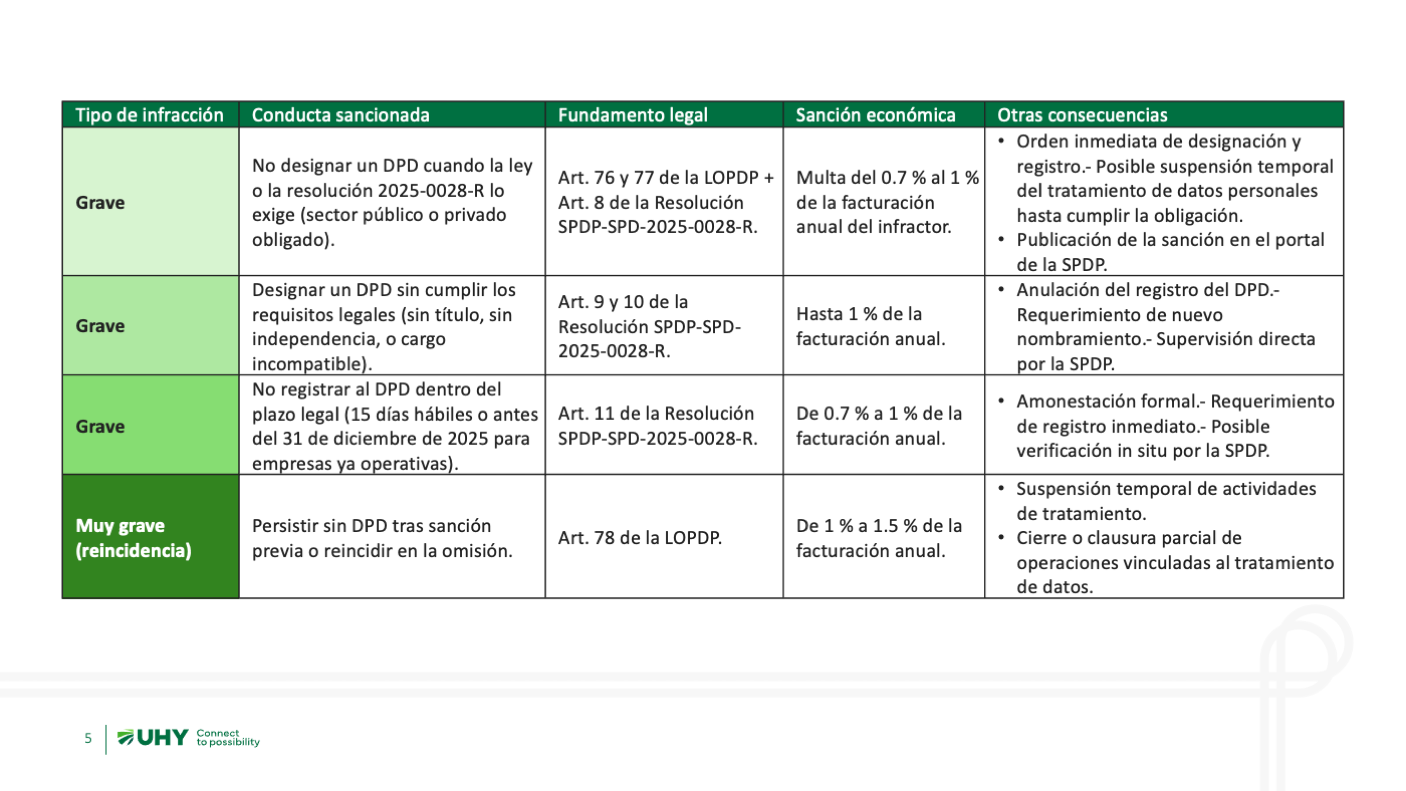 🔸 Otras consecuencias: orden inmediata de designación y registro, posible suspensión temporal del tratamiento de datos personales y publicación de la sanción en el portal de la SPDP.